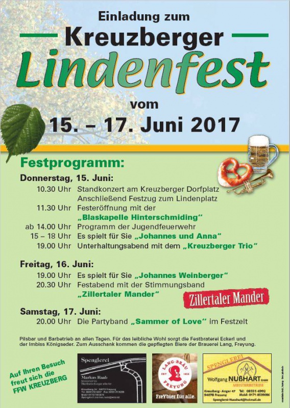 | Donnerstag, 15. Juni: 10:30 Uhr Standkonzert am Kreuzberger Dorfplatz Anschließend Festzug zum Lindenplatz 11:30 Uhr Festeröffnung mit der „Blaskapelle Hinterschmiding“ ab 14.00 Uhr Programm der Jugendfeuerwehr 15 – 18 Uhr Es spielt für Sie „Johannes und Anna“ 19:00 Uhr Unterhaltungsabend mit dem „Kreuzberger Trio“ Freitag, 16. Juni: 19:00 Uhr Es spielt für Sie „Johannes Weinberger“ 20:30 Uhr Festabend mit der Stimmungsband Samstag, 17. Juni: 20:00 Uhr Die Partyband „Sammer of Love“ im Festzelt Auf Ihren Besuch freut sich die FFW KREUZBERG |