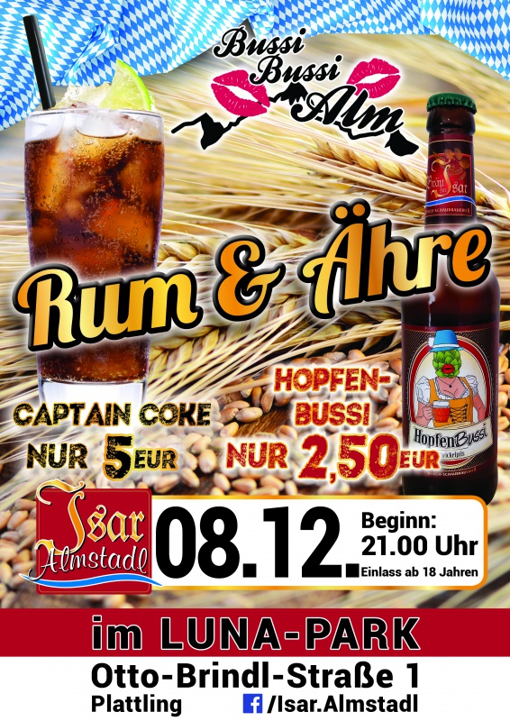 RUM & ÄHRE wem diese gebührt! -und des san alle unsre fleißign Almstadler und Bussi-Bussi-Geber sowieso Desweng kost da Captain Coke desmoi bloß 5€ und a Hopfen-Bussi gibts sogar für 2,50€! Am DJ John Taylor gebührt a wos: und zwar unser ganze guade Laune und Tanzlust, der gibt nämlich wieder seine genialen Beats zum Besten Und fralle: unter alln de der Veranstaltung bei Facebook zuasong VERLOSMA am Freitag den 08.12.: -> 3x Wodka Bull Mass -> 3x Cuba Mass -> 3x Lemon Mass -> 3x 5er Hopfen Bussi Einlösen bloß am Freitag (08.12.) möglich! Für de Hungrigen unter eich hama vorm Stadl extra unser Würschtl-Imperium afbaut (do gibts lauda guads Zeig wia z.B frische, knusprige, Pommes )Eure Bussi-Bussi-Alm-Crew |