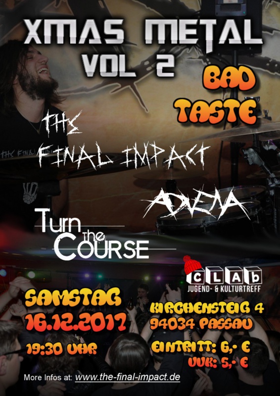 | Unter dem Motto "Bad Taste" findet am 16. Dezember 2017 im cLAb die zweite Xmas-Metal-Party mit The Final Impact statt. Euch erwarten besondere Specials, wie zum Beispiel ein Wettbewerb fürs schrägste Outfit mit Gewinnspiel u.v.m. Musikalisch umrahmt wird dieser besonders schräge Abend von 3 Metal-Bands: AdvenA, Turn The Course und The Final Impact Karten im Vorverkauf gibt's bei den verschiedenen Bandmitglieder oder HIER. Turn the Course Post Metalcore aus Schweinfurt AdvenA Progressive Metal aus Bad Griesbach The Final Impact NuMetal aus Passau PS: Die Bilder der Xmas-Metal-Party 2016 findet Ihr ... HIER. ... komplette Galerie anzeigen >> |