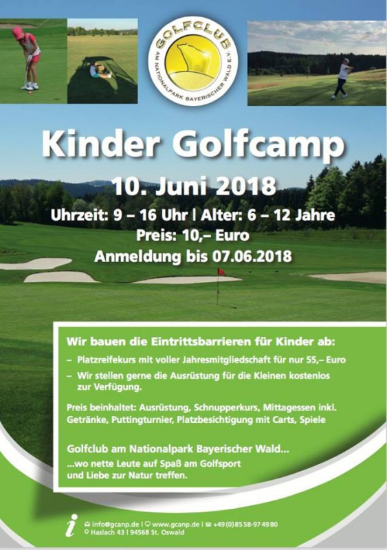 | Wir bauen die Eintrittsbarrieren für Kinder ab: Platzreifekurs mit voller Jahresmitgliedschaft für nur 55,00€ Wir stellen gerne die Ausrüstung für die Kleinen kostenlos zur Verfügung. Preis beinhaltet: Ausrüstung Schnupperkurs Mittagessen inkl. Getränke Puttingtunier Platzbesichtigung mit Carts Spiele Anmeldung bis 07.06.2018 Alter: 6 - 12 Jahre Golfclub am Nationalpark Bayerischer Wald... ...wo nette Leute auf Spaß am Golfsport und liebe zur Natur treffen. |