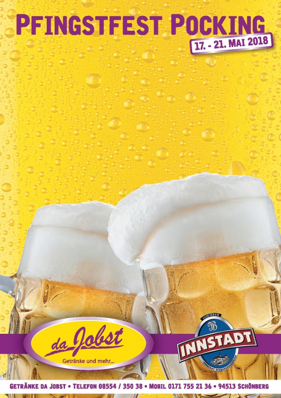 | Programm: Donnerstag, 17. Mai 2018 Partynacht 18.00 – 20.00 Uhr zur Einstimmung auf das Pfingstfest gibt es zu jeder Maß einen Verzehrgutschein im Wert von € 2,00 der an allen Tagen in der Festküche eingelöst werden kann 20.00 - 01.00 Uhr Partynacht mit der Show- und Coverband Keep Cool Freitag, 18. Mai 2018 Pfingstfestauftakt 17.00 Uhr Standkonzert der Stadtkapelle Pocking vor dem Rathaus 17.30 Uhr Festzug zum Festplatz Bieranstich und Eröffnung des Volksfestes durch den Schirmherrn und 1.Bürgermeister Franz Krah bis 19.00 Uhr Unterhaltung im Festzelt mit der Stadtkapelle Pocking 19.00 – 24.00 Uhr Stimmung im Festzelt mit Österreichs schärfster Showband Die Dorfer Samstag, 19. Mai 2018 Pockinger Feierabend und Abend der Betriebe, Landwirte und Behörden 14.00 – 17.00 Uhr musikalische Unterhaltung im Festzelt mit der Trachtenkapelle Fürstenzell 18.00 – 19.00 Uhr Reindlzeit aus der Festküche 19.00 Uhr Abend der Betriebe, Landwirte und Behörden 19.00 – 24.00 Uhr Stimmung und Gemütlichkeit mit der Band die 3 Z´widern Sonntag, 20. Mai 2018 Tag der Familie 11.00 Uhr Frühschoppen im Festzelt mit frischen Weißwürsten 12:00 Uhr Mittagstisch für die ganze Familie 14:00 Uhr Seniorennachmittag 11:00 - 17:00 Uhr Stimmung und gemütlichkeit mit Guat draf 19.00 – 24.00 Uhr Musik-Tanz-S |