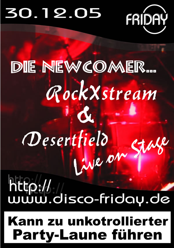 | Das hats im Friday bisher noch nicht gegeben. Live on Stage die zwei Newcomer-Bands RockXstream und Desertfield. Dazu gibts wie immer besten DJ Sound. Und das allerbeste ist, der Eintritt kostet keinen Cent mehr als sonst! |