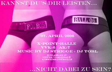 "Kannst Du's Dir leisten... ...nicht dabei zu sein" FOS/BOS - BALL '06 Music by: "DJ Tobl" und "DJ Strigge" Eintritt ab 17 Jahren Musikwünsche auch per email möglich |