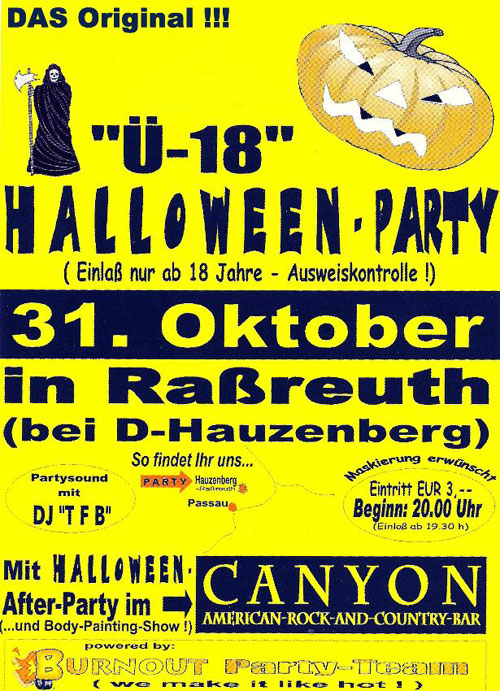 | Nach Jahren endlich wieder Party-Time in Raßreuth !!! Die erste Ü-18-Halloween-Party steigt, und zwar so wie es sich gehört am RICHTIGEN Halloween-Tag, dem 31.Oktober 2006 im Trachtensaal-Raßreuth bei Hauzenberg. Bekannte Location - neues Ambiente ! Coole Deko, Wein- & Cocktailbar, Halloween-Party-Bar, Pilsbar, Body-Painting-Show, Leuchtstäbe,... und...und...und... Als besonderes Schmankerl gibt´s für jeden Gast einen Fitness-Gutschein im Wert von EUR 10,-- des Fitness-Studios "FOREVER-ACTIVE" aus Hauzenberg-Oberkümmering !!! Für Music-Power sorgt DJ TFB, der wieder das volle Party-Repertoire geben wird ! Ab 20.00 h bis 1.00 h morgens gibt's heiße Rythmen und Party-Sound pur und ab 1.01 h geht's bei der HALLOWEEN-After-Party auf Stage2 (in der American-Country-and-Rock-Bar "CANYON" bis voraussichtlich 5.00 h morgens weiter.Hier wird eine tolle Body-Painting-Show vom mehrfachen Meister und Preisgewinner seines Fachs geboten (natürlich wird auf nackter Haut "gebodypaintet" !). Mit dabei sind natürlich auf vielfachen Wunsch wieder die allseits beliebten "LEUCHTSTÄBCHEN". Unser DJ wird Euch wieder reichlich damit versorgen ! Ach ja, Halloween-Maskierung ist selbstverständlich erwünscht ! Hoffentlich sehen wir uns.... ...check it out on Halloween... ...Euer Burnout-Party-Team P.S.: Eintritt ab 18 Jahre (Ausweis nicht vergessen !!!) Kurze Anfahrtsbeschreibung ( für alle, die nicht wissen, wo "Raßreuth" ist ): "Raßreuth" ist ein Ortsteil von 94051 Hauzenberg. Ihr müsst einfach von Hauzenberg aus Richtung "Sonnen / Breitenberg" fahren. Ca. 1 km nach Hauzenberg geht´s links rein nach "Freudensee / Raßreuth". Dann ca. 2 km weiterfahren und durch "Raßreuth" durchfahren. Am Ortsende von Raßreuth geht´s links rauf zum "Trachtensaal" bzw. "CANYON-American-Bar". Dann seid ihr auch schon da im Party-Point-Raßreuth ! Denn Ihr wisst ja: "Fight for your right......to Paaaaaarty" !!! |