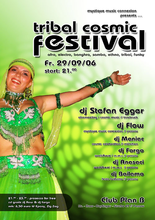 | >>Prosecco for free till 23:00 >>Gratis CDs an der Kasse bis 23:00 >>VVK: 6,50 // VVK-Stelle: Zig Zag - Epoxy afro | cosmic | house | ethno | world | tribal | groove | funky --------------------Main Chapel - Cosmic Area------------------- # DJ STEFAN EGGER (Afromeeting // Innsbruck // Austria) -- www.stefan-egger.com -- www.cosmic-music.com -- seit 1987 organisiert stefan egger das afro meeting in innsbruck das längst zu den unverzichtbaren afro cosmic events in europa zählt. stefan egger ist veranstalter in österreich und deutschland, produzent bei sound station records und als dj in allen großen afro cosmic clubs in Europa zu finden. musikstil :: COSMIC, TRIBAL, REGGAE RHYTHM , WORLD MUSIC # DJ Maniac (Cosmic Celebration // München) -- www.cosmic-celebration.de -- seinen ersten live-auftritt hatte dj maniac am 9. november 1996 auf der brainscan-party in der mehrzweckhalle seeshaupt. seine musik entspricht einer mischung aus brasil-cumbia-andino-ethno liedern und afro-cosmic-scheiben. im jahr 1998 gründete er die veranstaltungsreihe cosmic celebration, die mittlerweile zu den größten cosmic veranstaltungen in deutschland zählt. nicht nur als veranstalter ist er aktiv, sondern auch als produzent und ist auf vielen cosmic festen im raum münchen, augsburg und innsbruck zu hören. letztes jahr war er auch zum ersten mal in italien im jamaé in ancona zu hören. musikstil :: BRASIL, CUMBIA, ANDINO, ETHNO, AFRO # DJ FLOW (Mystique Music // Kreutalm ´02 // Afro United ´01 & ´05) -- www.mystique-music.de -- ----------------------Main Chapel - Support----------------------- # DJ Bailamo (Mystique Music // Festa Bailamo // Passau) -- www.mystique-music.de -- # DJ Fargo (Mystique Music // Worldbeat // Passau) -- www.mystique-music.de -- # DJ ANASACI (Mystique Music // Worldbeat // Passau) >> VISUALS // PERCUSSION WELCOME |