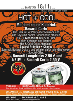 | Mit dem neuen Kultdrink Bacardi Corto. Alle Girls in Hot Pants oder Minirock und alle Boys mit cooler Sonnenbrille erhalten 10,- € Gutscheine bis 22.00 Uhr beim bezahlen des Eintritts. Hot & Cool Gogo Animation. Bacardi Prämien X-Change. Sammelt Bacardi Dollars und erhaltet dafür tolle Give Aways. Special Offer: » Bacardi Longdrinks 2.50 € und NEU!!! » Bacardi Corto 2,50 € |