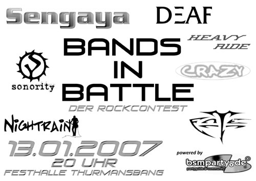 | Bands in Battle - Der Rock Contest Die geilsten regionalen Rockbands live!!! Powered by BSM-Party!!! Am 13.01.2007 findet in Thurmansbang der „Bands in Battle“ Rock-Contest statt, und der Sieger, den Ihr wählt, wird bei der internationalen Rockband Zoo Army im Vorprogramm spielen dürfen! Außerdem bekommt die Siegerband ein Studiowochenende zwecks Demoproduktion im Nocturn Tonstudio in Rosenheim geschenkt! Abstimmen für Euere Lieblingsband könnt Ihr an dem Abend per Stimmzettel, den Ihr an der Kasse bekommen werdet, was sicher nicht einfach werden wird, denn es werden hier lauter erstklassige Rockbands auftreten! Es wird nach dem Contest noch eine "offene Bühne" geben, auf der jeder Musiker die Möglichkeit hat noch einmal bei einer Jam-Session mit den unterschiedlichsten Musikern mal auf der Bühne zu stehen. Diese Option steht natürlich auch Musikern frei, die nicht bei den auserwählten Bands dabei sind! Das endgültige Line-UP ist bestätigt!!! Alle Bands in alphabetical order: Crazy Deaf Fate Heavy Ride Nightrain Sengaya Sonority Rock Party Pur !!! 14.01.07 Hi Ihr alle, es war ein super Erfolg! Wir möchten uns hiermit bei Euch allen für diesen erstklassigen Rockabend bedanken. Bei allen Bands, die an dem Event beteiligt waren, sowie bei Euch, den Rockfans, die diese super Veranstaltung erst möglich gemacht haben! Die Wahl zum Sieger war sicher keine leichte Aufgabe für Euch, weil wirklich jede einzelne Band, die aufgetreten ist, den Sieg verdient gehabt hätte. Aber wie es halt bei Contests so ist, kann es nur einen Gewinner geben. Ihr habt gewählt und mit Eueren Stimmen dafür entschieden, dass Nightrain am Freitag, den 26.01.07 in Thurmansbang mit Zoo Army und Flashover auf der Bühne stehen wird. Wir gratulieren Nightrain hiermit zum 1. Platz beim Bands in Battle Rockcontest 2007 !!! An alle Bands die diese Wahl nicht gewonnen haben: Seid deshalb nicht deprimiert, denn für alle Anwesenden war jede einzelne Band der Sieger in seiner Klasse! Wir sehen uns am Freitag, den 26.01.07 wieder in der Festhalle Thurmansbang bei der Winter Rock Night 2007 mit Zoo Army, Nightrain und Flashover! Party On - Ihr rockt! LG ...Stevie |