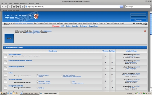 Es gibt ja im WWW für alles und jeden eine Seite um sich zu treffen und zu plaudern... nur warum gab es das für Autofreaks aus dem Passauer Raum noch nicht? Sebastian A. (off Risal(41)) hatte die Idee mal einfach bei Google zu stöbern, ob es schon sowas gibt - Fehlanzeige. Noch ein Check bei denic.de, ob die gewünschte Domain noch frei war - was sie dann auch war -, gleich bestellt und sofort an die Arbeit gemacht. So entstand innerhalb von wenigen Stunden das Internetportal Tuning-Scene-Passau.de, welches für alle Autofans und -schrauber aus der Region offen steht - natürlich auch für alle anderen! Welche Marke man fährt, wie alt man ist, egal ob Männlein oder Weiblein - jeder ist willkommen.