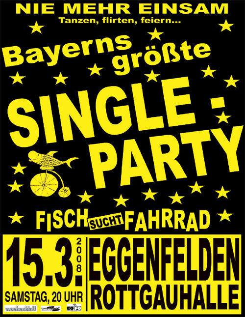 Romantik wie bei Romeo und Julia und baggern bis sich die Balken biegen. Das alles erleben die Gäste am 15. März auf Bayerns größter SINGLE-PARTY in der Rottgauhalle Eggenfelden, wenn es wieder heißt: „Fisch sucht Fahrrad“. Hier treffen sich junge und jung gebliebene Leute, die Kontakt suchen und keinen festen Partner haben. Der Name „Fisch sucht Fahrrad“ ist einem amerikanischen Frauenroman entnommen. Aus diesem Buch stammt der Spruch: „Eine Frau ohne Mann ist wie ein Fisch ohne Fahrrad“. In über 140 deutschen Städten war Deutschlands große Single-Party schon erfolgreich zu Gast und hat bereits Kult-Status erreicht. Und jetzt kommt sie wieder nach Eggenfelden, um kontaktwilligen, einsamen Herzen die Chance zu geben, den Partner fürs Leben zu finden. In unserer von Hektik und Leistungsdruck dominierten Zeit wächst die Zahl der Alleinstehenden jeder Altersstufe. Viele haben die Suche nach dem Partner fürs Leben zurückgestellt oder gar ganz aufgegeben. Dass es nicht so
