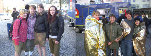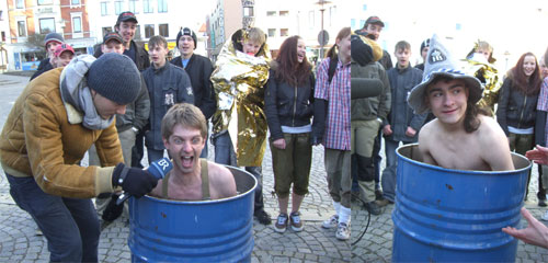 Regen. Sie waren einst normale Studenten der FH Deggendorf im Studienfach Medientechnik. Dann entdeckten sie youtube, myspace und Konsorten zur Verbreitung ihrer verrückten Clips. Auch beim Internetfernsehsender der FH Deggendorf, doschauher.tv, waren sie eine feste Größe. Mittlerweile fahren sie für die Jugendsendung "Südwild" des bayerischen Fernsehens durch den Freistaat auf der Suche nach lustigen Geschichten. Die Rede ist von den Woidboyz. Diese Woche waren sie zu Gast im Bayerischen Wald, genauer gesagt in Regen. In der Dienstags-Sendung haben die Woidboyz Andi und Uli eine Stadtwette angekündigt. Mindestens 20 Woidboyz-Fans in angemessener Bekleidung sollten am Regenener Stadtplatz erscheinen. Und tatsächlich am Mittwoch kamen dann auch etwas mehr wie 20 verrückte Gestalten zum Medialiner der Woidboyz. Mädels in Lederhose, Jungs oben ohne oder in Rettungsfolie eingehüllte Menschen mit Teppischklopfern bewaffnet. Dann wurde ein Wettkampf zwischen den Fans und den Boyz ausgetragen. Erste Disziplin: Härte zeigen im kalten Wasser.