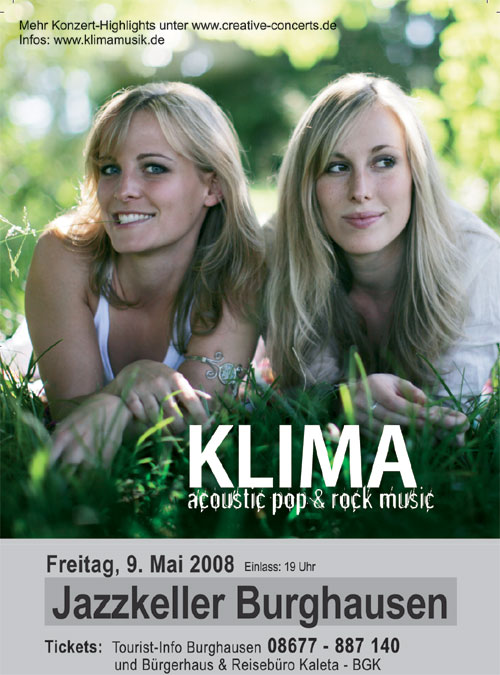 Deutsche Songs vermischt mit ein paar englischen Eigenkompositionen, groovend, rockig und immer melodiös, dazu zwei unter die Haut gehende Stimmen, die sich in traumhaft perfekter Harmonie ergänzen – das sind die Markenzeichen von Sarah und Vera Klima. „Das beste Klima seit der Eiszeit“ urteilte ein Kritiker, nachdem die beiden gutaussehenden Frontgirls mit ihrer Band beim Deutschen Rock & Pop-Wettbewerb gleich drei Preise abgeräumt hatten. Dass