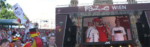 Wien. Drei Wochen lang wurde der Alltag vieler fußballsüchtiger Menschen von der Europameisterschaft in Österreich und der Schweiz bestimmt. Die ersten spielfreien Tage lösten schon Freizeit-Verwendungs-Probleme aus – vor demselben Problem werden auch jetzt wieder einige stehen, denn seit gestern ist sie vorbei die Euro 2008. Spanien hat im Finale verdient mit 1:0 gegen die deutsche Auswahl gewonnen. Hunderttausende haben das Spiel auf der offiziellen Fanmeile in Wien verfolgt, unter ihnen ein Dutzend bsmparty.de-Fotografen. „Fahr‘ ma am Sonntag nach Wien?“ „Freili!“ Gesagt, getan. Sonntagvormittag um elf ging es von Passau mit dem ICE nach Wien Westbahnhof. Mit an Bord hunderte grölende, singende und sich gegenseitig mit Deutschlandfahnen bemalende Fans. Auch ein, zwei Spanier konnte man erhaschen. In Österreichs Hauptstadt angekommen ging es zu Fuß auf zur Fanmeile. Zwischendurch noch schnell eine große Fahne gekauft, einen Schal und Kopfbedeckung geschenkt bekommen, vor nem großen Fußballschuh ein Gruppenfoto gemacht und schon war