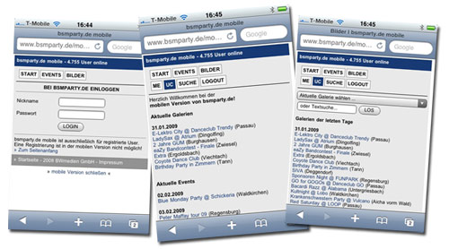 Wir haben der mobilen Version von bsmparty.de rund 2 Monate nach dem Launch Anfang Dezember 2008 ein Faceliftung verpasst. Dabei haben wir die Navigation überarbeitet und diese in eine öffentliche (Start, Events und Bilder) und eine Usernavigation (UserCard, Messages, UserSuche und Logout) aufgeteilt.
