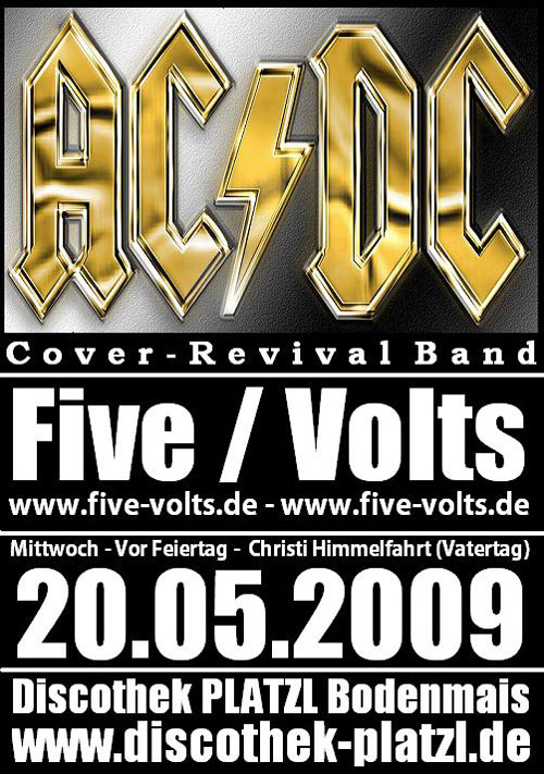 Bodenmais. Exklusiv zur AC/DC Welttournee präsentiert die Discothek Platzl in Bodenmais am Mittwoch, 20. Mai, die AC/DC-Coverband Five/Volts .