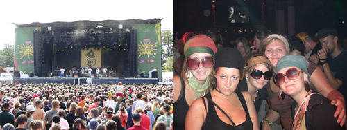 links: die Mainstage; rechts: Auch diese fünf Mädels waren durchweg mit dem Festival zufrieden.
