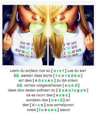 | Das sage ich über mich selbst: | Lebe jeden Tag so als wäre es dein letzter, irgendwann wirst du recht berhalten!! |
